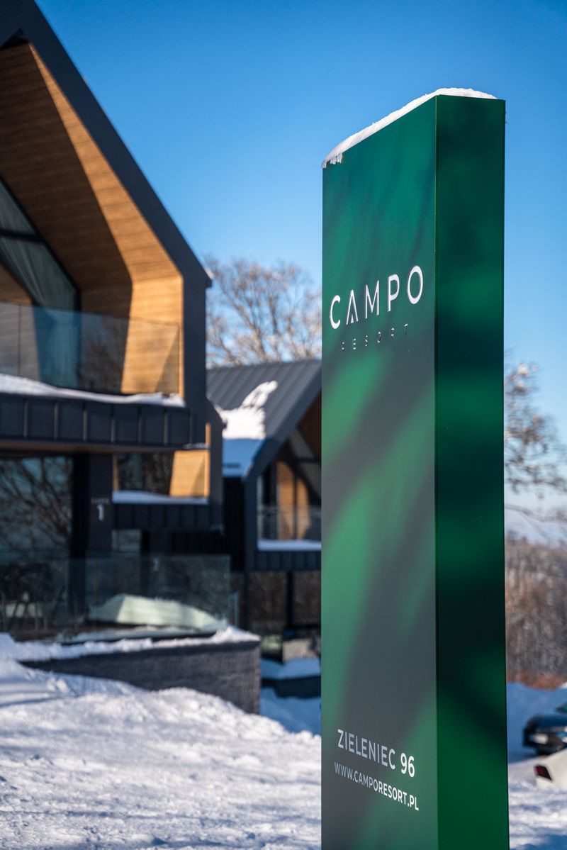 Zagospodarowanie terenu Campo Resort przemyślano tak, aby budynki tworzyły luźną, z pozoru przypadkową, krajobrazową kompozycję – niczym w niewielkiej alpejskiej wiosce. Wszystkie domy zwrócone są swoimi przeszklonymi ścianami w tę samą stronę i usytuowane w taki sposób aby zapewnić gościom pełną prywatność, jednocześnie zapewniając niezakłócony niczym widok na las i góry.